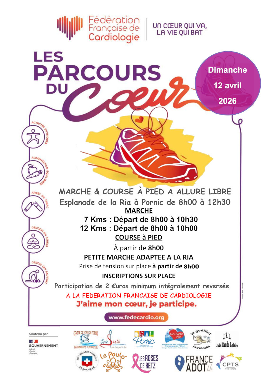 En partenariat avec la Fédération Française de Cardiologie, l’association Soinsanté et le Centre de soins Infirmiers de Pornic organisent une marche au départ de la Ria pour soutenir cette noble cause. Comme à l’accoutumée, les fonds seront destinés à la Fédération.
